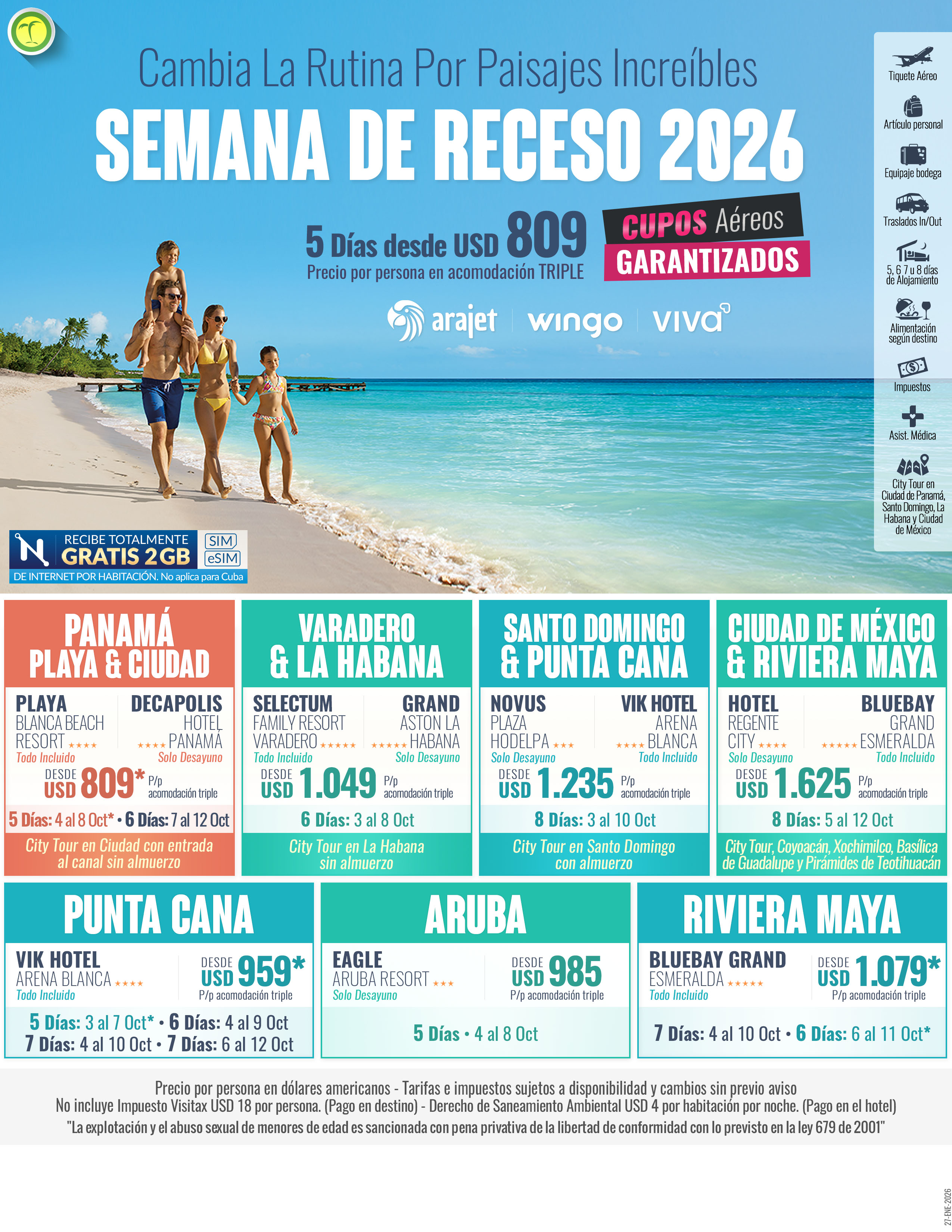 •Obsequio 2GB de internet por habitación. (La SIM Card es un obsequio, si no es compatible con su teléfono no hay reembolso).