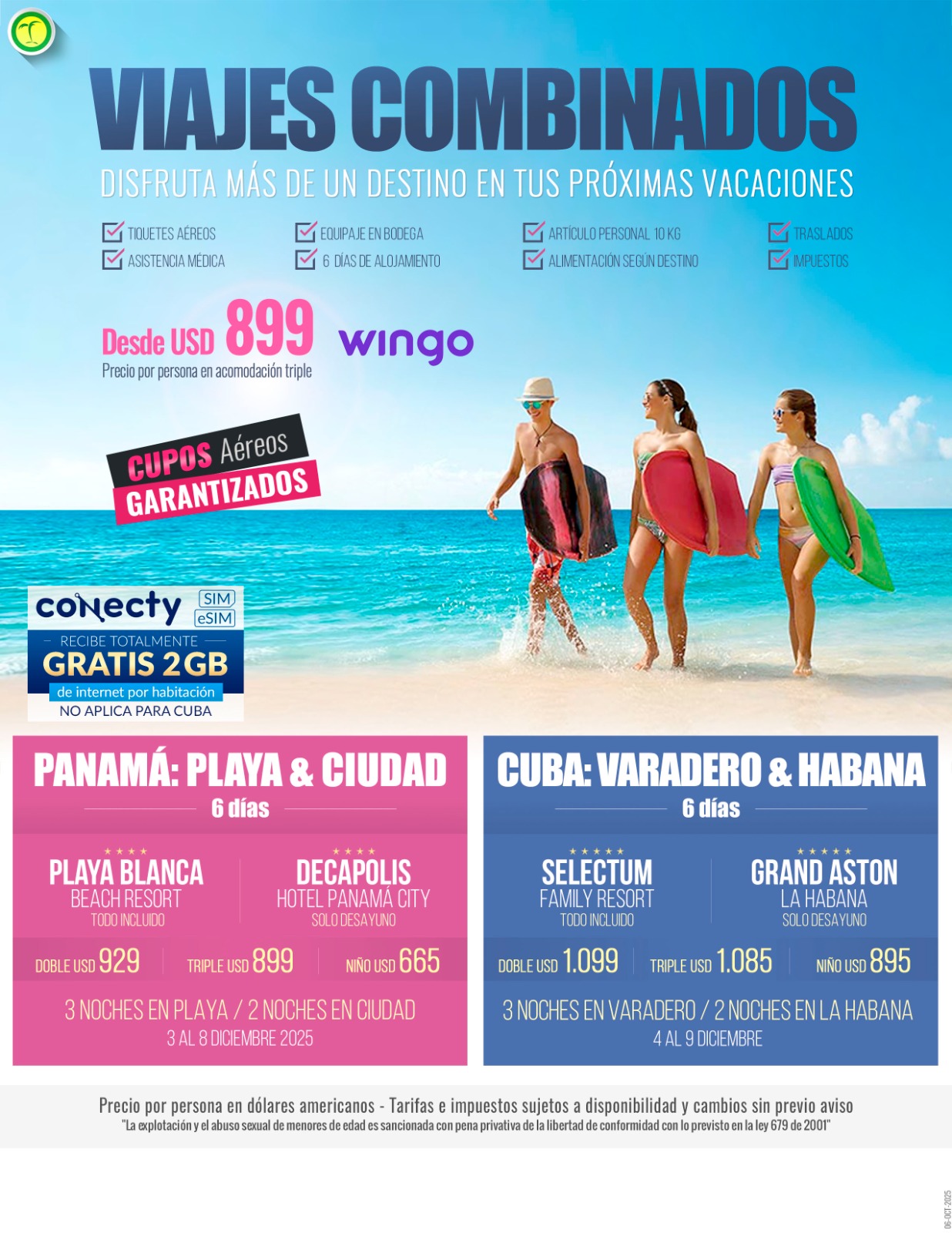 - Nuestros paquetes incluyen- • Tiquetes aéreos Bogotá – Panamá – Bogotá vía Wingo. - • Impuestos del tiquete y salida de los países. - • Alojamiento 2 noches en ciudad con desayunos diarios de acuerdo al plan de viaje seleccionado. - • Alojamiento 2, o 3 noches en playa todo incluido de acuerdo al plan de días seleccionado - • City Tour & Canal de Panamá Mediodía con entrada al Canal de Panamá (Sin almuerzo). - • Traslados aeropuerto – hotel playa – hotel ciudad – aeropuerto. - • Tarjeta de asistencia médica para menores de 85 años. - • 2% fee bancario. - • Propinas e impuestos hoteleros. - • 1 Morral o cartera (40x35x25 cm) el cual debe caber debajo del asiento del avión. - • Maleta de bodega de 23 Kg. - • Obsequio 2GB de internet por Habitación (La SIM Card es un obsequio, si no es compatible con su teléfono no hay reembolso). - SOLO HOTEL EN PLAYA - • Snacks entre comidas. - •Bebidas y licores ilimitados (+18). - • Toallas para la playa y las piscinas. - Deportes acuáticos no motorizados. - IMPORTANTE - • Todas las fechas de viaje indicadas son ingresando por alojamiento en hotel de playa, y saliendo por hotel de ciudad, adicionalmente siempre el traslado de hoteles de playa a hoteles en ciudad es a las 12:30pm desde el lobby del hotel.