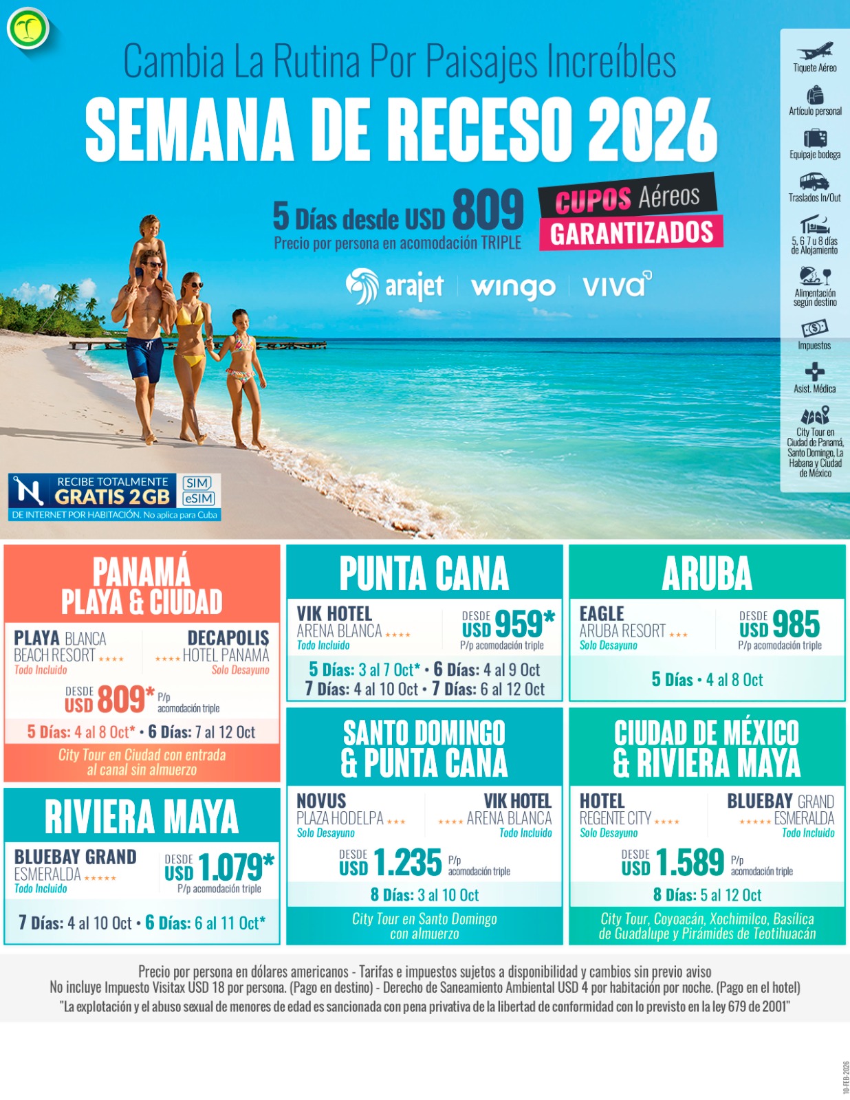 *Tarifas y disponibilidad sujetas a confirmación previa por parte del alojamiento, aerolínea. Tarifas en Dólar Estadounidense.