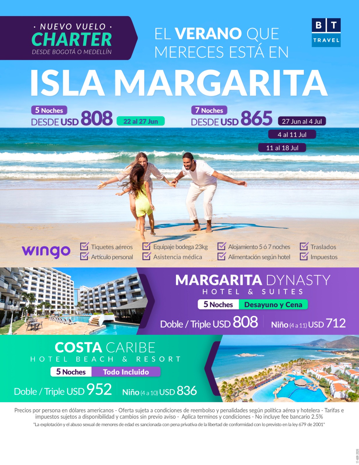 • Tiquetes aéreos Bogotá – Porlamar -Bogotá Vía Wingo vía Chárter.