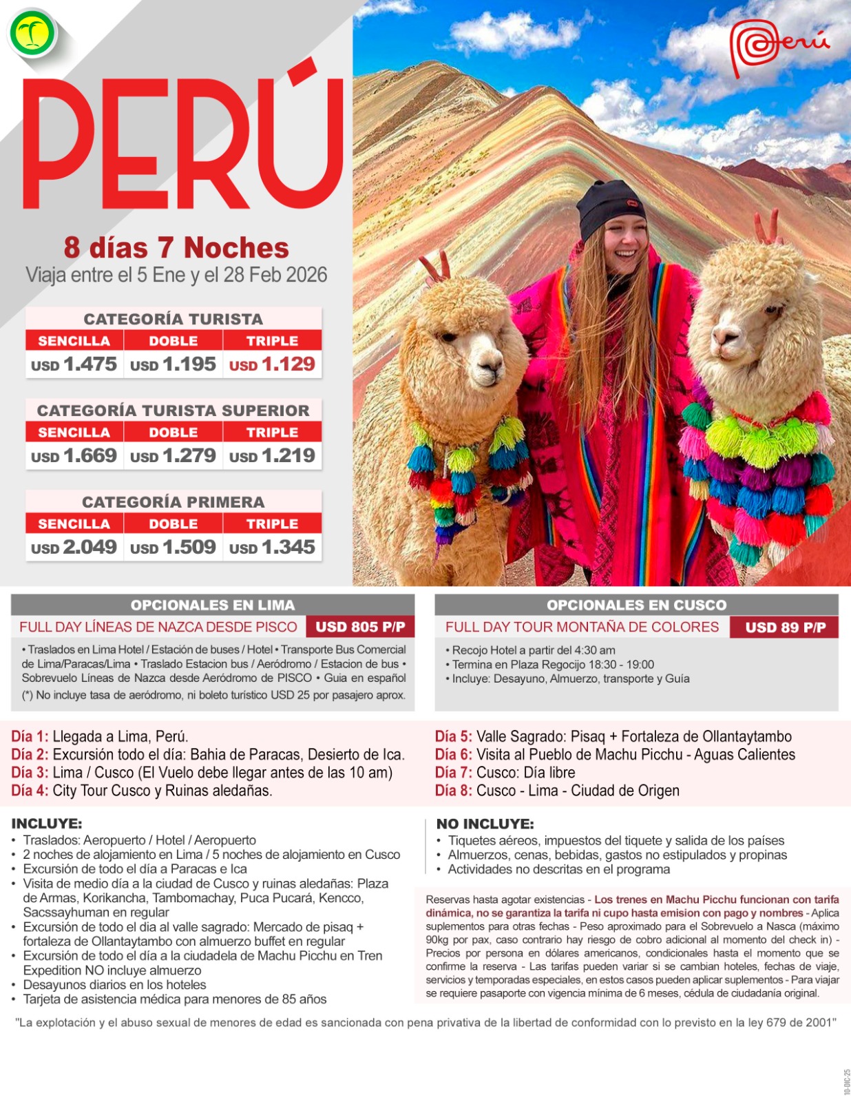 | Turista Superior | 05 Ene al 28 Feb 2026 (8D) | U$ 1.669 | U$ 1.279 | U$ 1.219 |