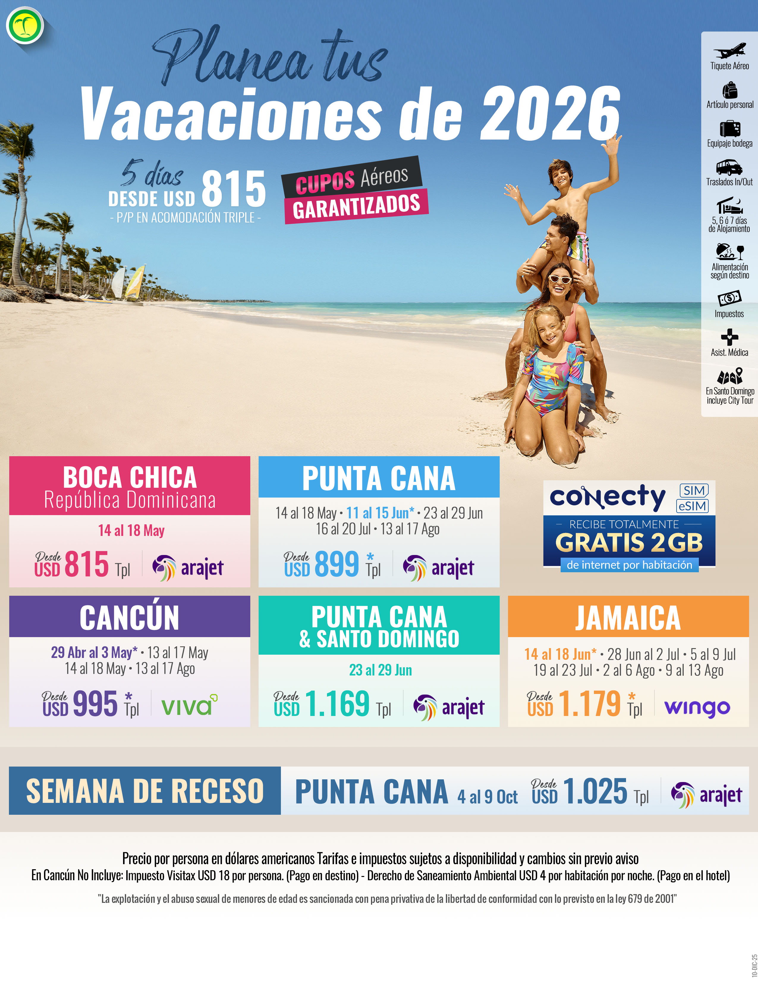 *Tarifas y disponibilidad sujetas a confirmación previa por parte del alojamiento, aerolínea. Tarifas en Dólar Estadounidense.
