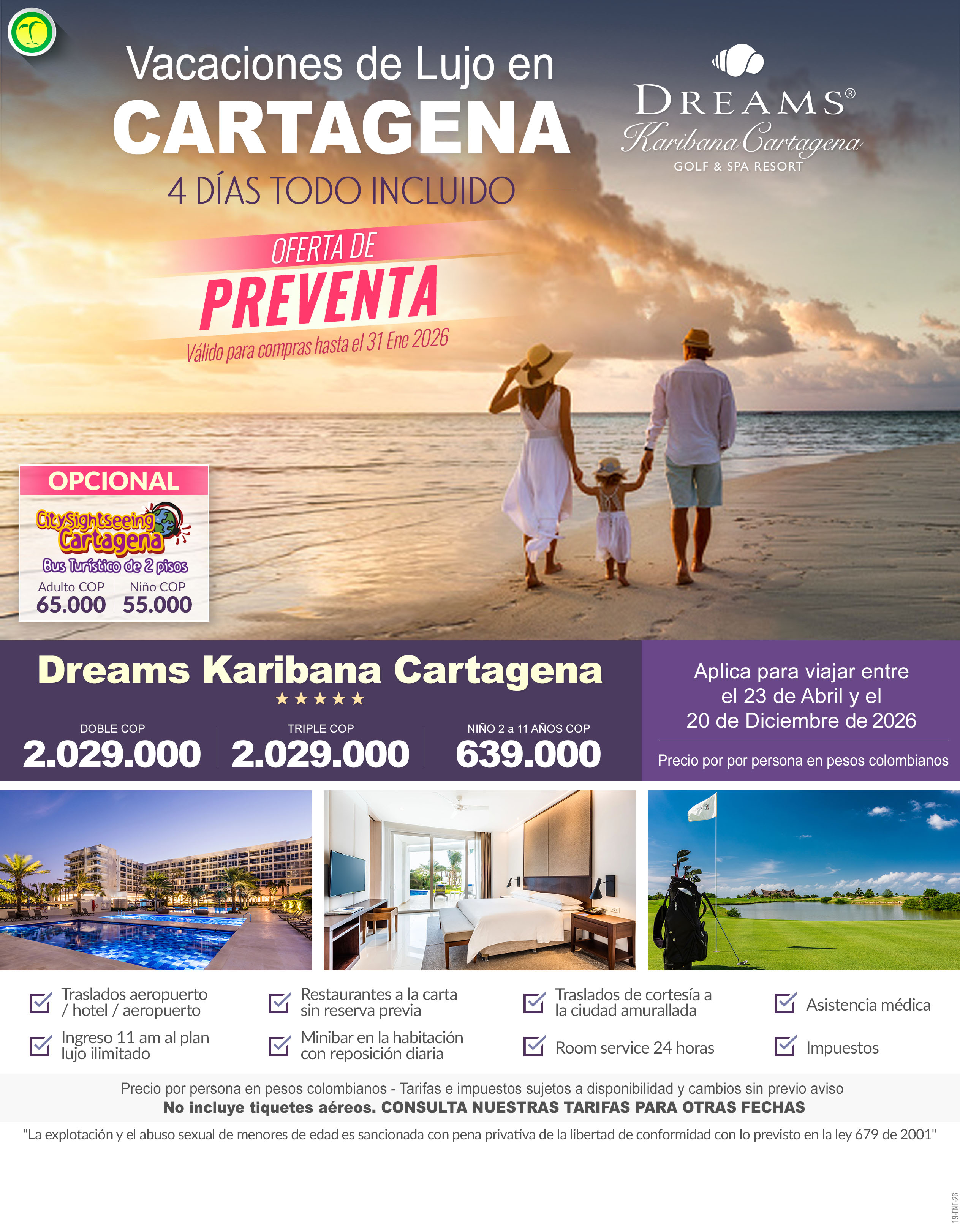 Dreams Karibana Cartagena Beach & Golf Resort tiene una ubicación ideal, cerca de la dinámica e histórica ciudad de Cartagena y dentro de la comunidad privada prémium de Karibana. Cada habitación o suite ofrece un balcón o terraza privados con una impresionante vista al paisaje tropical, a las piscinas o al mar que las rodea. Las personas alojadas pueden saborear cocinas de todo el mundo en cinco opciones gastronómicas y degustar bebidas prémium en cuatro bares y lounges temáticos. Todo esto y más viene con la experiencia todo incluido Unlimited-Luxury®. Ubicado a solo 30 minutos de Cartagena, Dreams Karibana Cartagena ofrece la ubicación perfecta para una escapada familiar o en pareja para conocer un destino único.
