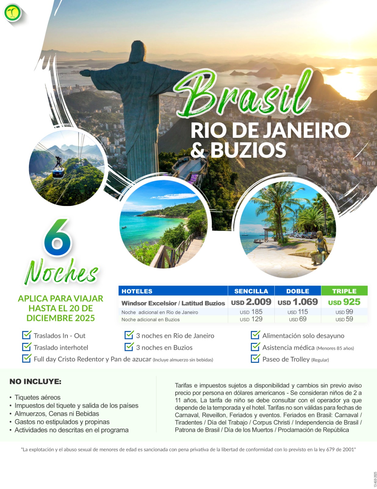 - Nuestros paquetes incluyen- • Traslados aeropuerto / hotel / aeropuerto e interhotel en compartido. - • 3 noches de alojamiento en Rio de Janeiro - • Full Day Cristo Redentor y Pan de Azúcar con almuerzo (No incluye bebidas) y con guía español – inglés. - • 3 noches de alojamiento en Buzios. - • Paseo de Trolley Regular. - • Desayuno diario en los hoteles. - • Tarjeta de asistencia médica para menores de 85 años.